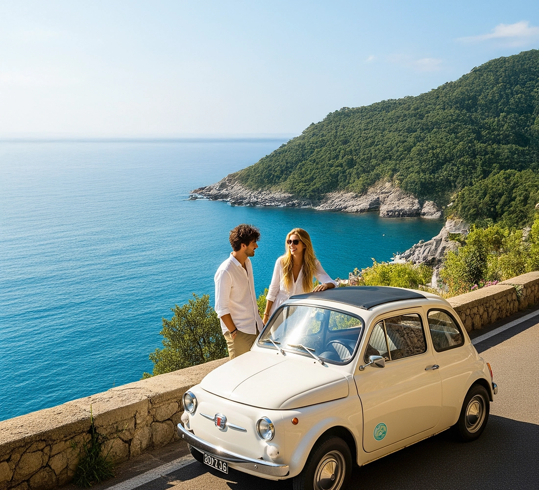 Scopri la straordinaria bellezza della Costiera Amalfitana su una Fiat d'epoca con la tua guida turistica e ammira alcuni dei borghi più pittoreschi d'Italia, da Positano a Ravello, Amalfi e la splendida Atrani.